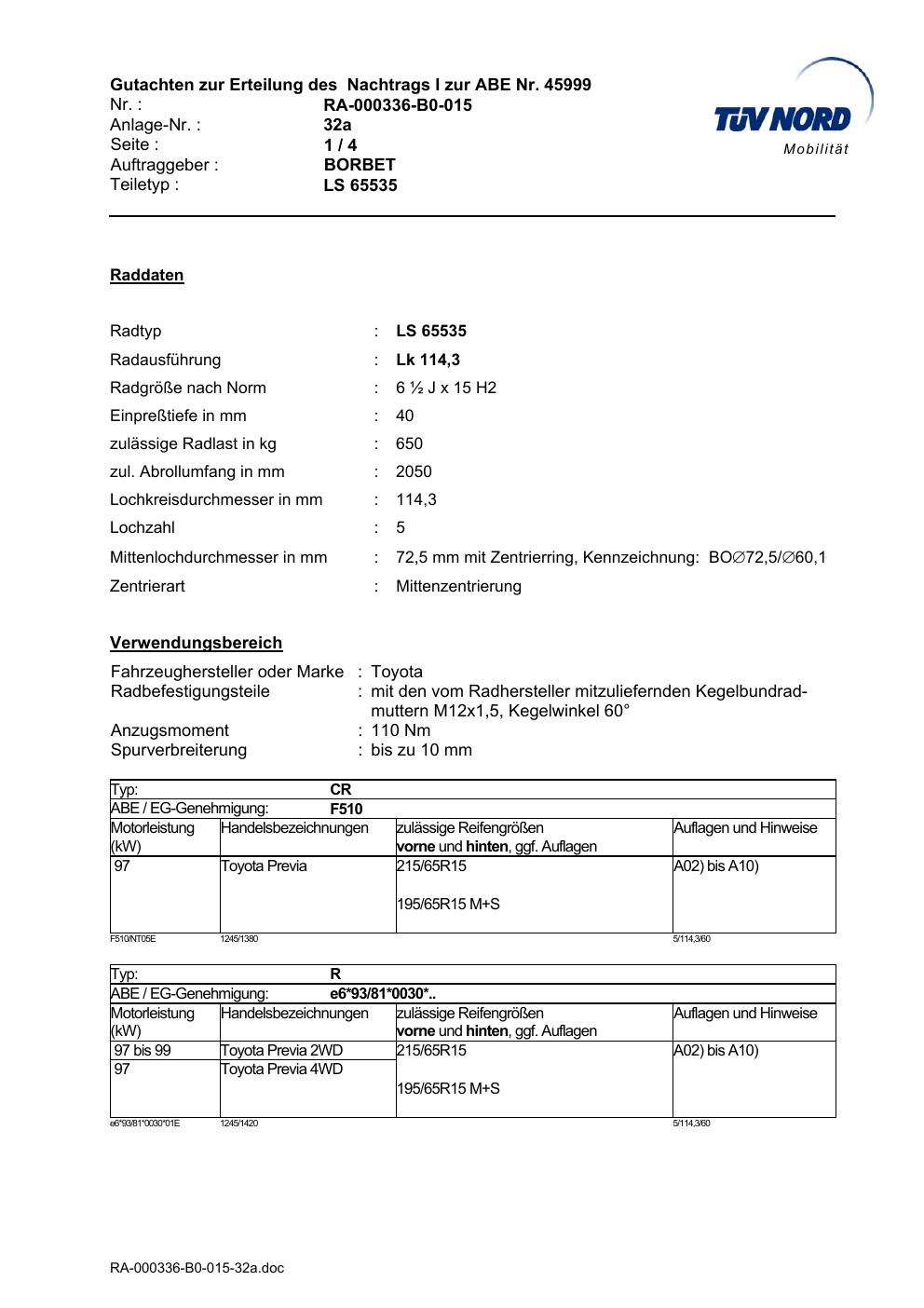 • Stimmt die KBA-Nummer auf der Felge mit diesem Dokument überein?