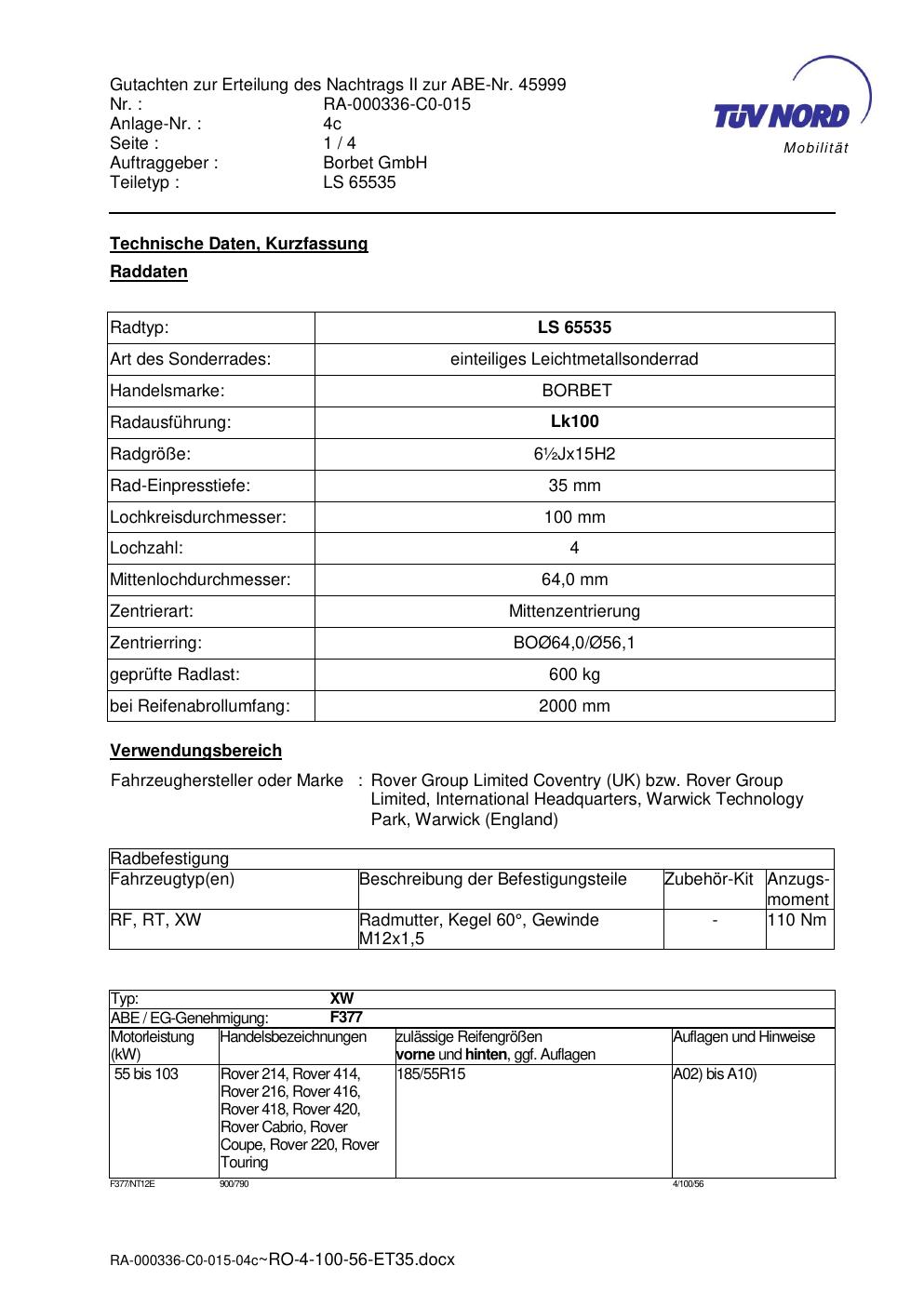 • Stimmt die KBA-Nummer auf der Felge mit diesem Dokument überein?