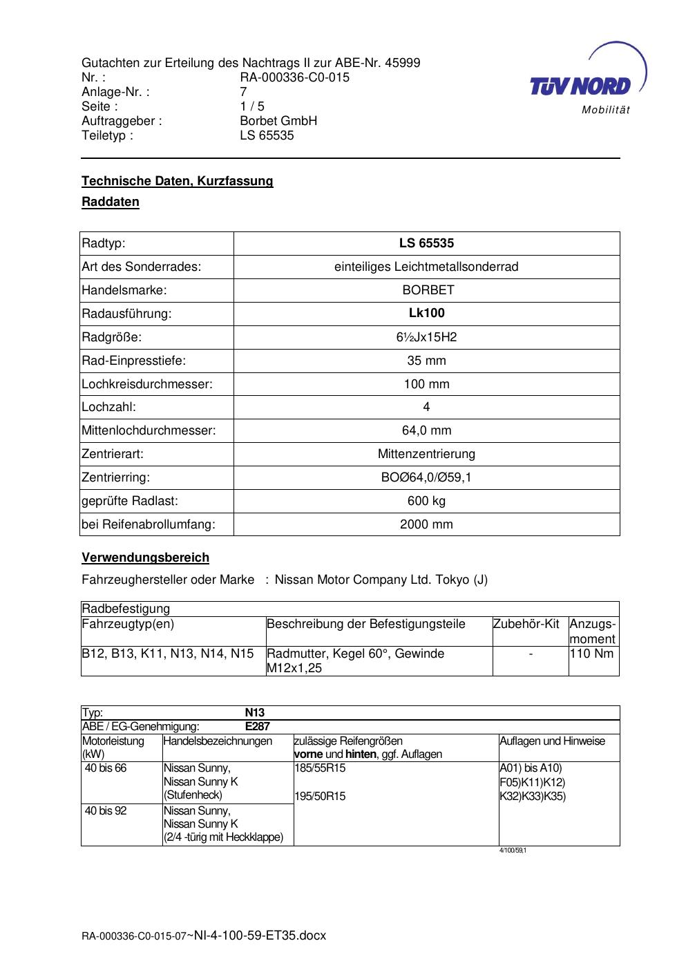 • Stimmt die KBA-Nummer auf der Felge mit diesem Dokument überein?