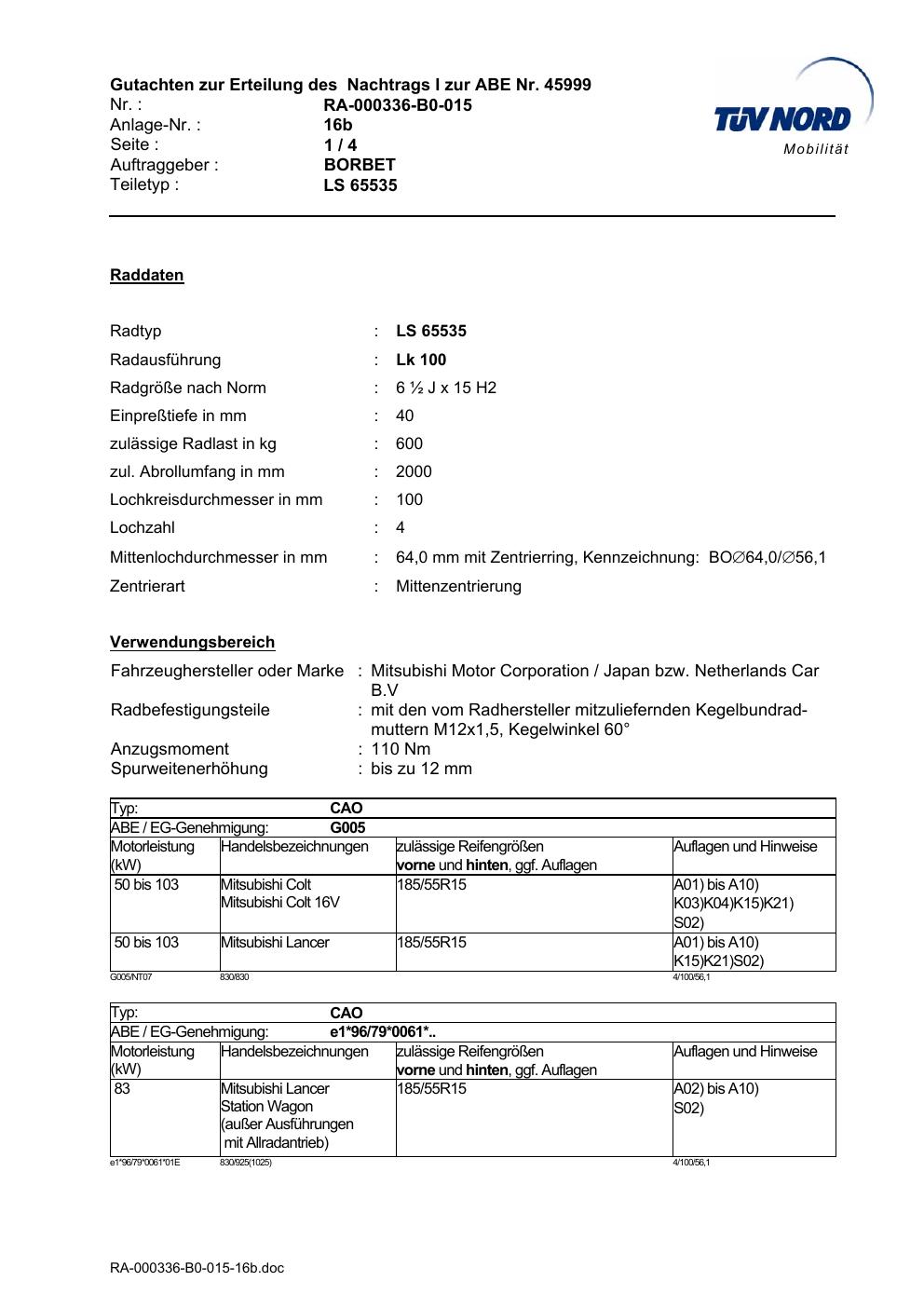 • Stimmt die KBA-Nummer auf der Felge mit diesem Dokument überein?