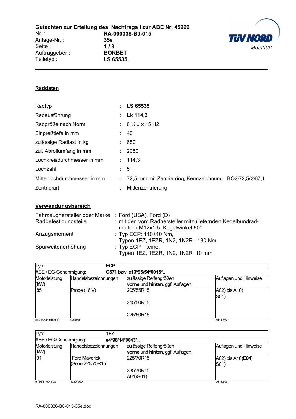 • Stimmt die KBA-Nummer auf der Felge mit diesem Dokument überein?
