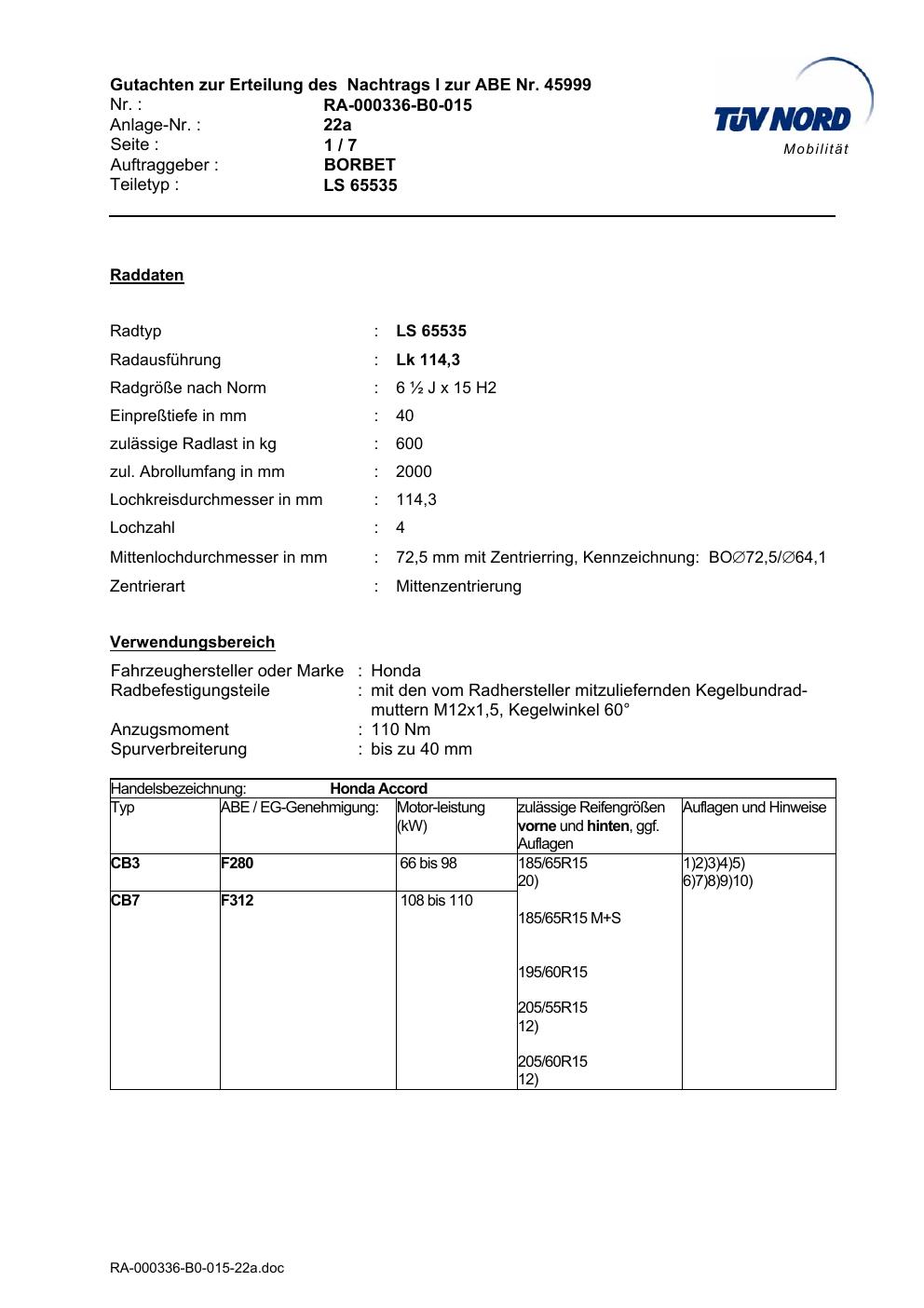 • Stimmt die KBA-Nummer auf der Felge mit diesem Dokument überein?