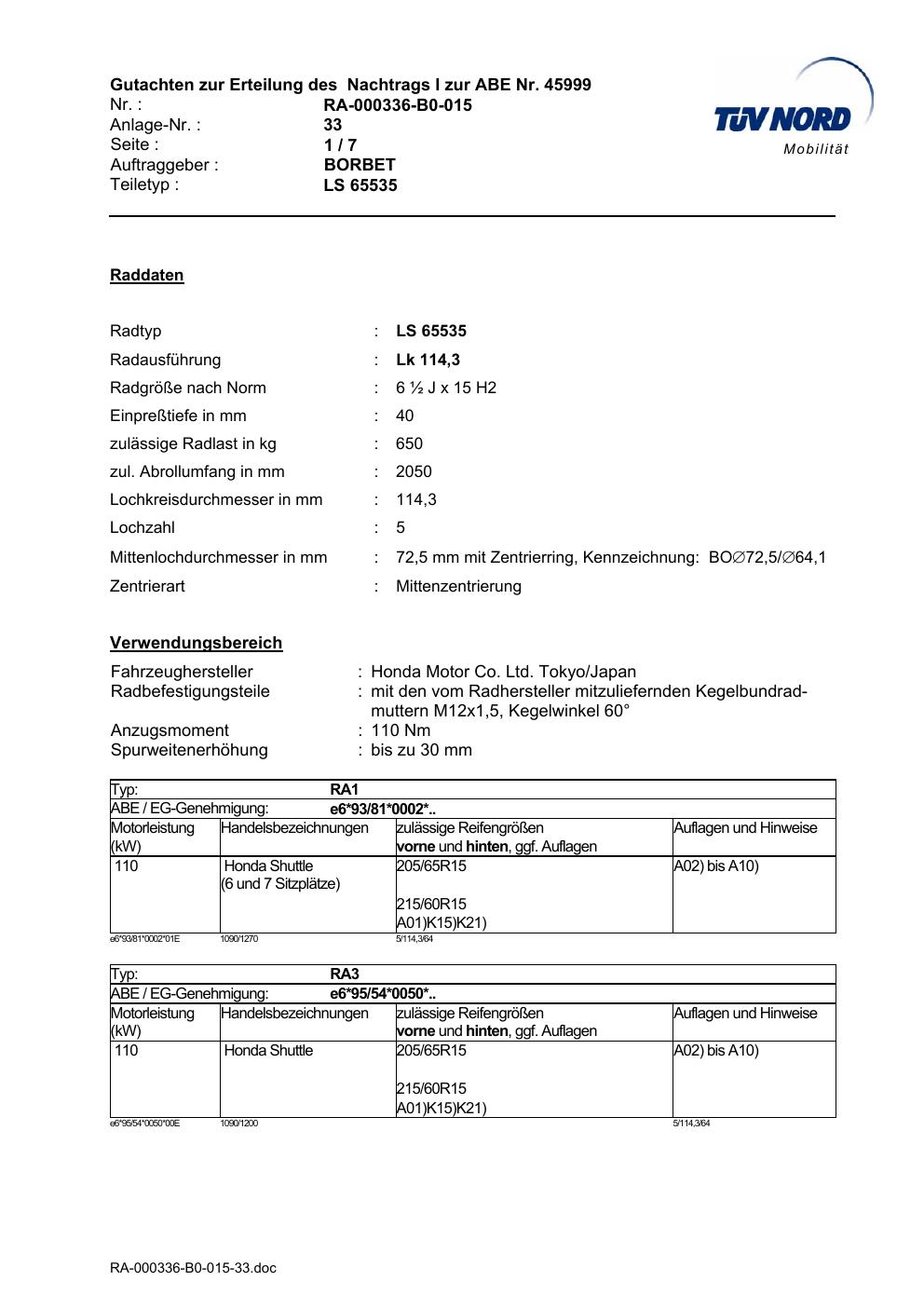 • Stimmt die KBA-Nummer auf der Felge mit diesem Dokument überein?
