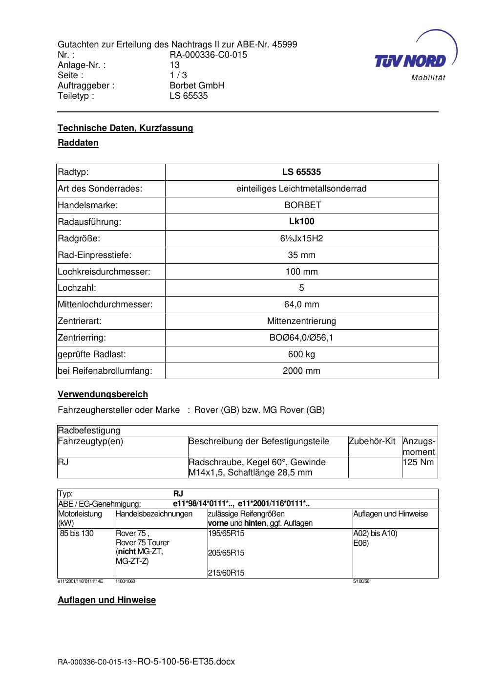 • Stimmt die KBA-Nummer auf der Felge mit diesem Dokument überein?