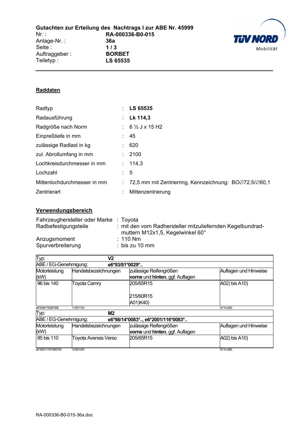 • Stimmt die KBA-Nummer auf der Felge mit diesem Dokument überein?
