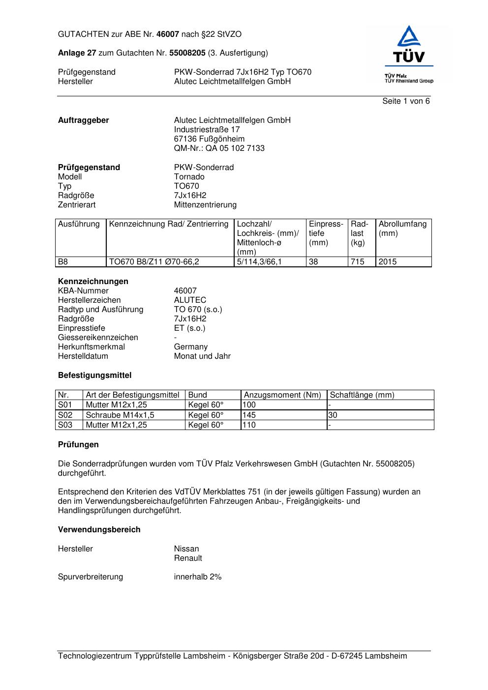 Dieses Gutachten (abe) bezieht sich auf die Alufelge ALUTEC TO670 in der Ausführung 7Jx16 ET 0, Mittenloch 0 mm (KBA 46007). Im PDF findest du typischerweise zulässige Reifengrößen, Auflagen/Anbauhinweise und – je nach Dokument – Hinweise zur Eintragung.