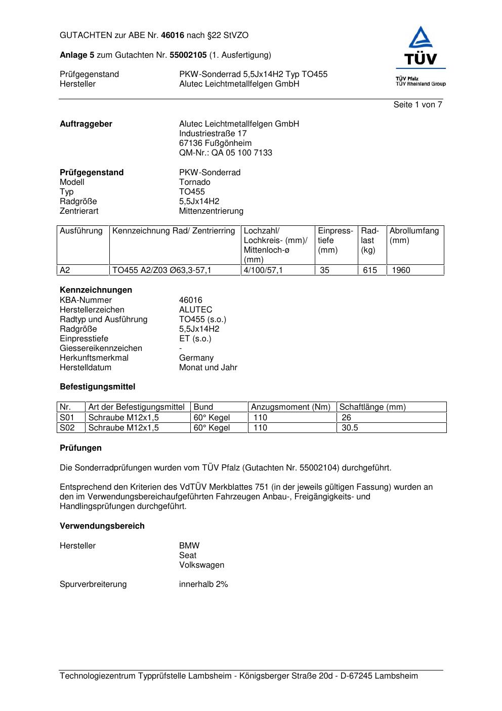 Dieses Gutachten (abe) bezieht sich auf die Alufelge ALUTEC TO455 Hersteller Alutec Leichtmetallfelge in der Ausführung 5.5Jx14 ET 0, Mittenloch 0 mm (KBA 46016). Im PDF findest du typischerweise zulässige Reifengrößen, Auflagen/Anbauhinweise und – je nach Dokument – Hinweise zur Eintragung.