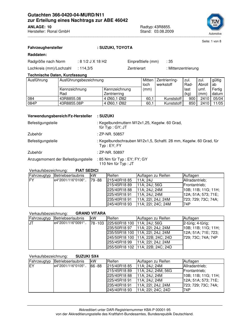 Dieses Gutachten (abe) bezieht sich auf die Alufelge Ronal 43R8855 in der Ausführung 2Jx18 ET 0, Mittenloch 0 mm (KBA 46042). Im PDF findest du typischerweise zulässige Reifengrößen, Auflagen/Anbauhinweise und – je nach Dokument – Hinweise zur Eintragung.