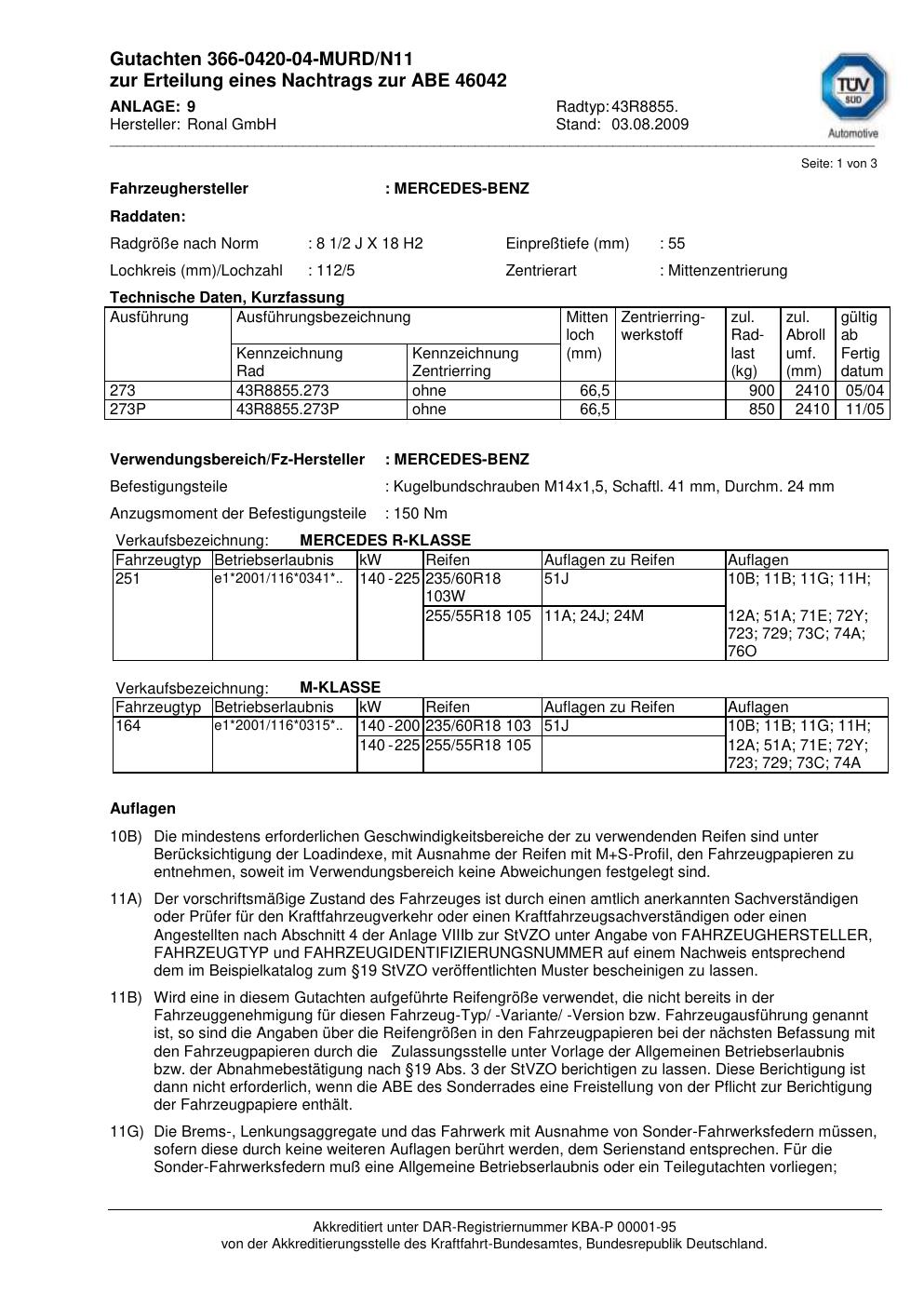 Dieses Gutachten (abe) bezieht sich auf die Alufelge Ronal 43R8855 in der Ausführung 2Jx18 ET 0, Mittenloch 0 mm (KBA 46042). Im PDF findest du typischerweise zulässige Reifengrößen, Auflagen/Anbauhinweise und – je nach Dokument – Hinweise zur Eintragung.