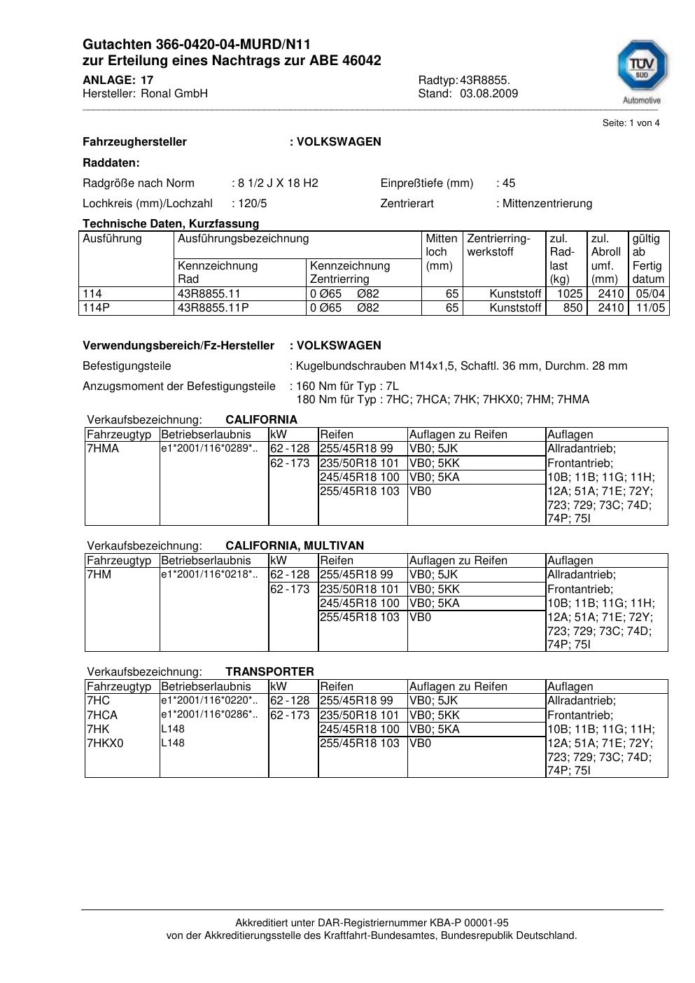 Dieses Gutachten (abe) bezieht sich auf die Alufelge Ronal 43R8855 in der Ausführung 2Jx18 ET 0, Mittenloch 0 mm (KBA 46042). Im PDF findest du typischerweise zulässige Reifengrößen, Auflagen/Anbauhinweise und – je nach Dokument – Hinweise zur Eintragung.