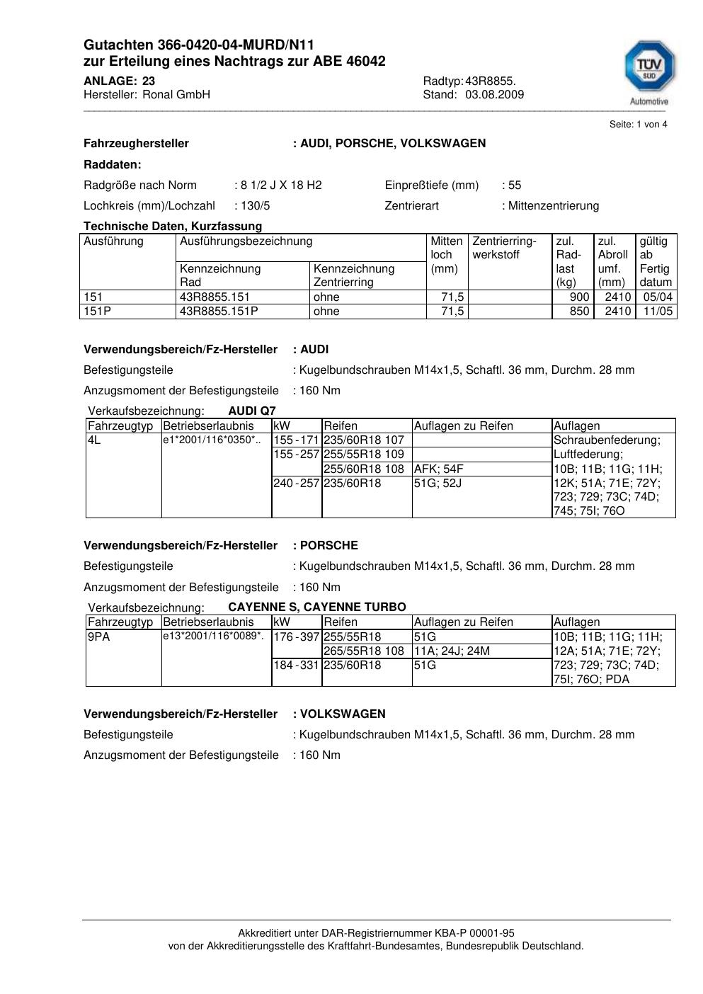 Dieses Gutachten (abe) bezieht sich auf die Alufelge Ronal 43R8855 in der Ausführung 2Jx18 ET 0, Mittenloch 0 mm (KBA 46042). Im PDF findest du typischerweise zulässige Reifengrößen, Auflagen/Anbauhinweise und – je nach Dokument – Hinweise zur Eintragung.