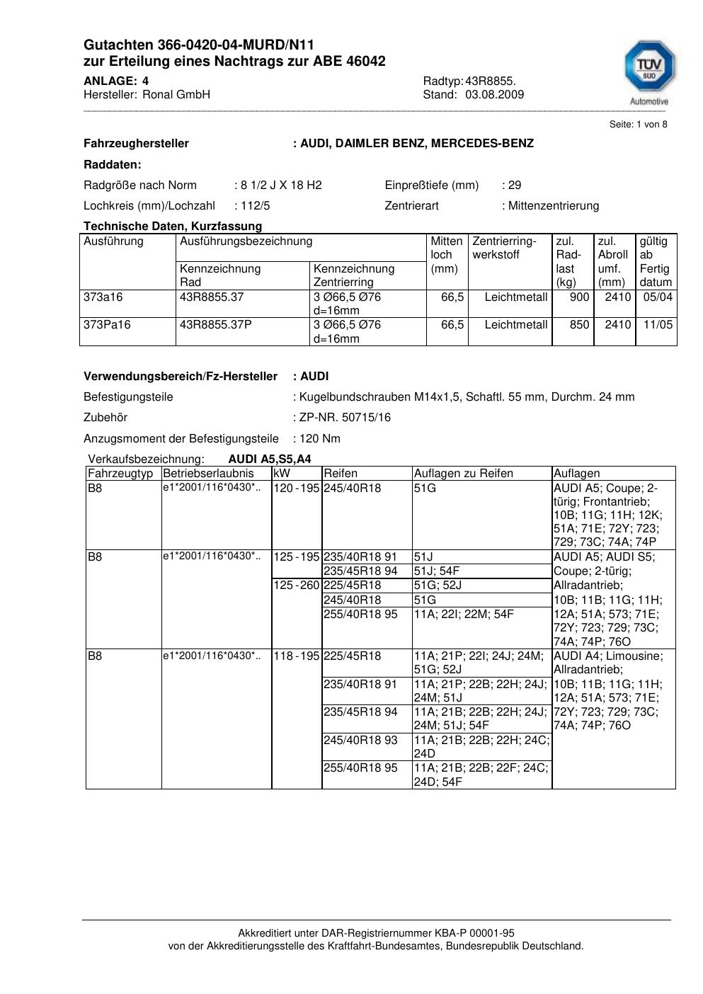 Dieses Gutachten (abe) bezieht sich auf die Alufelge Ronal 43R8855 in der Ausführung 2Jx18 ET 0, Mittenloch 0 mm (KBA 46042). Im PDF findest du typischerweise zulässige Reifengrößen, Auflagen/Anbauhinweise und – je nach Dokument – Hinweise zur Eintragung.