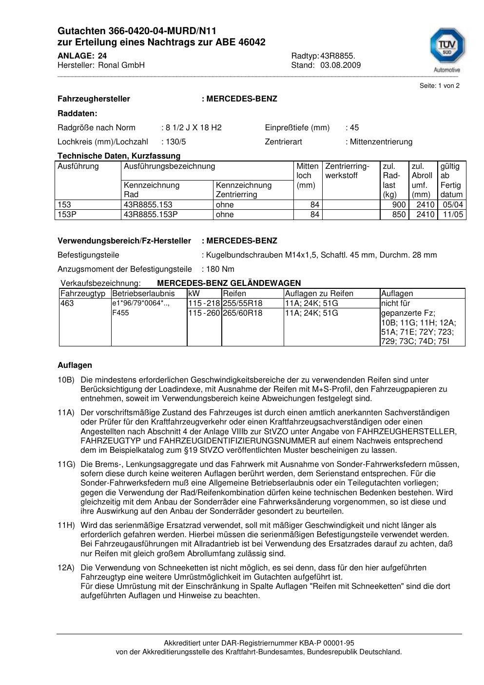 Dieses Gutachten (abe) bezieht sich auf die Alufelge Ronal 43R8855 in der Ausführung 2Jx18 ET 0, Mittenloch 0 mm (KBA 46042). Im PDF findest du typischerweise zulässige Reifengrößen, Auflagen/Anbauhinweise und – je nach Dokument – Hinweise zur Eintragung.