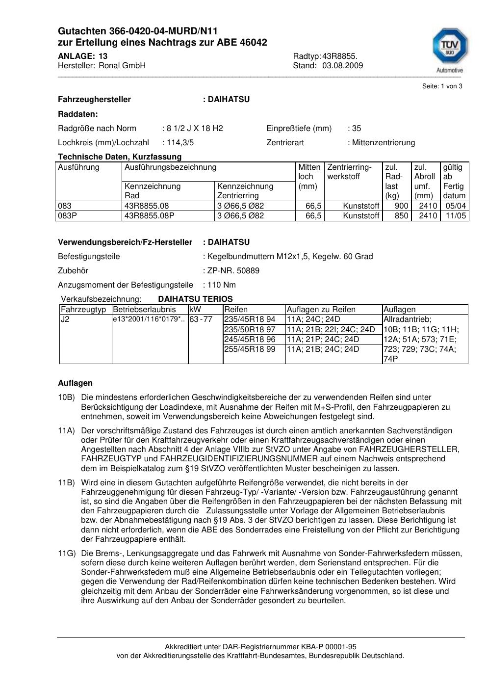 Dieses Gutachten (abe) bezieht sich auf die Alufelge Ronal 43R8855 in der Ausführung 2Jx18 ET 0, Mittenloch 0 mm (KBA 46042). Im PDF findest du typischerweise zulässige Reifengrößen, Auflagen/Anbauhinweise und – je nach Dokument – Hinweise zur Eintragung.