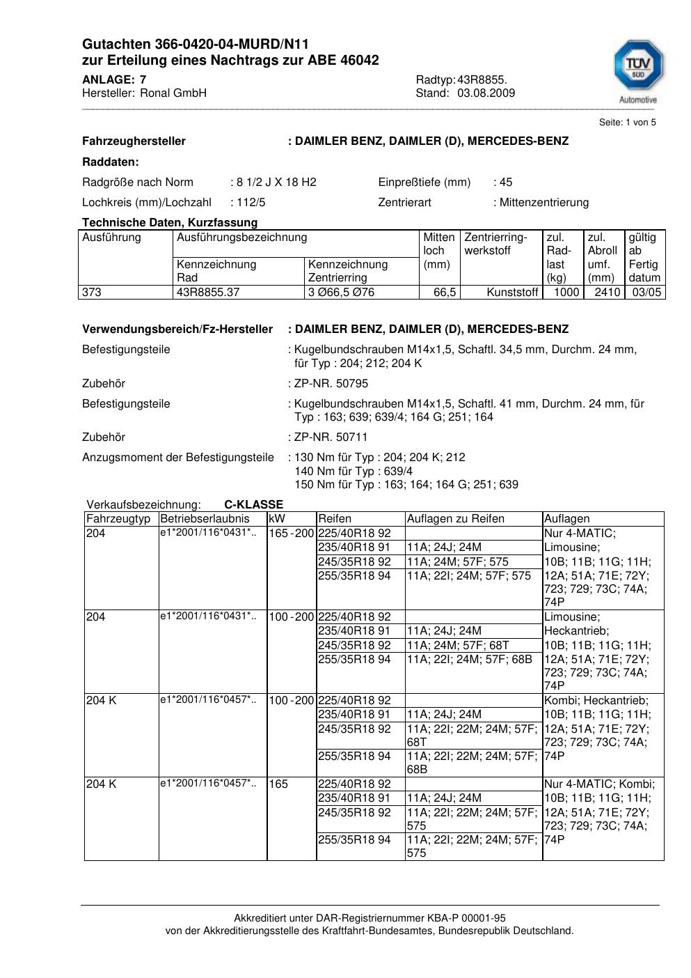 Dieses Gutachten (abe) bezieht sich auf die Alufelge Ronal 43R8855 in der Ausführung 2Jx18 ET 0, Mittenloch 0 mm (KBA 46042). Im PDF findest du typischerweise zulässige Reifengrößen, Auflagen/Anbauhinweise und – je nach Dokument – Hinweise zur Eintragung.