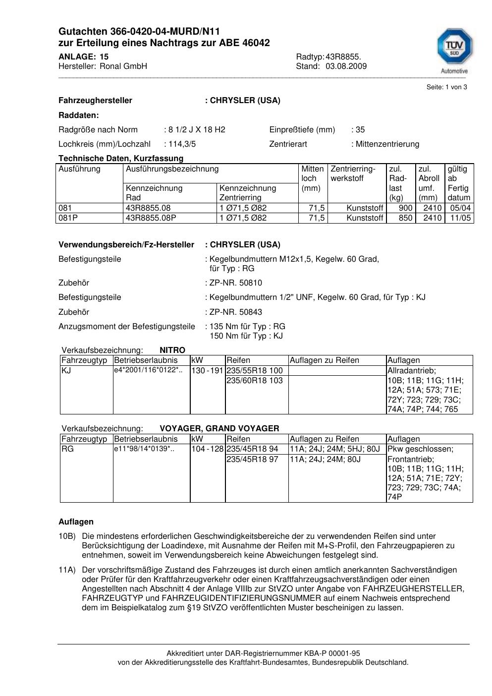Dieses Gutachten (abe) bezieht sich auf die Alufelge Ronal 43R8855 in der Ausführung 2Jx18 ET 0, Mittenloch 0 mm (KBA 46042). Im PDF findest du typischerweise zulässige Reifengrößen, Auflagen/Anbauhinweise und – je nach Dokument – Hinweise zur Eintragung.