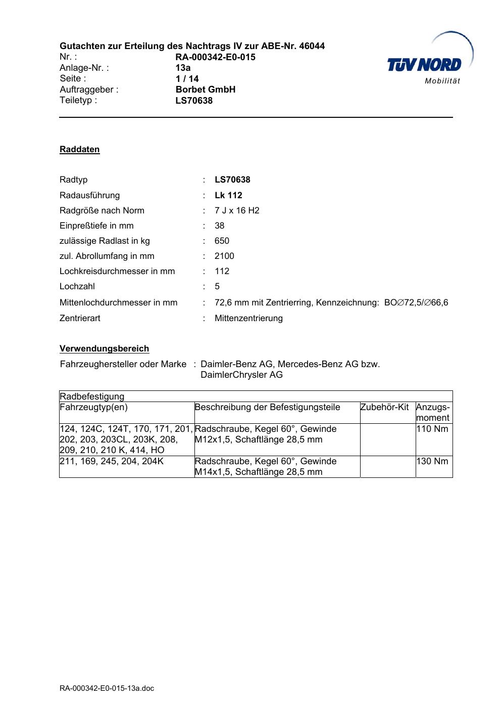 Dieses Gutachten (abe) bezieht sich auf die Alufelge brand-borbet LS70638 in der Ausführung 7Jx16 ET 0, Mittenloch 0 mm (KBA 46044). Im PDF findest du typischerweise zulässige Reifengrößen, Auflagen/Anbauhinweise und – je nach Dokument – Hinweise zur Eintragung.