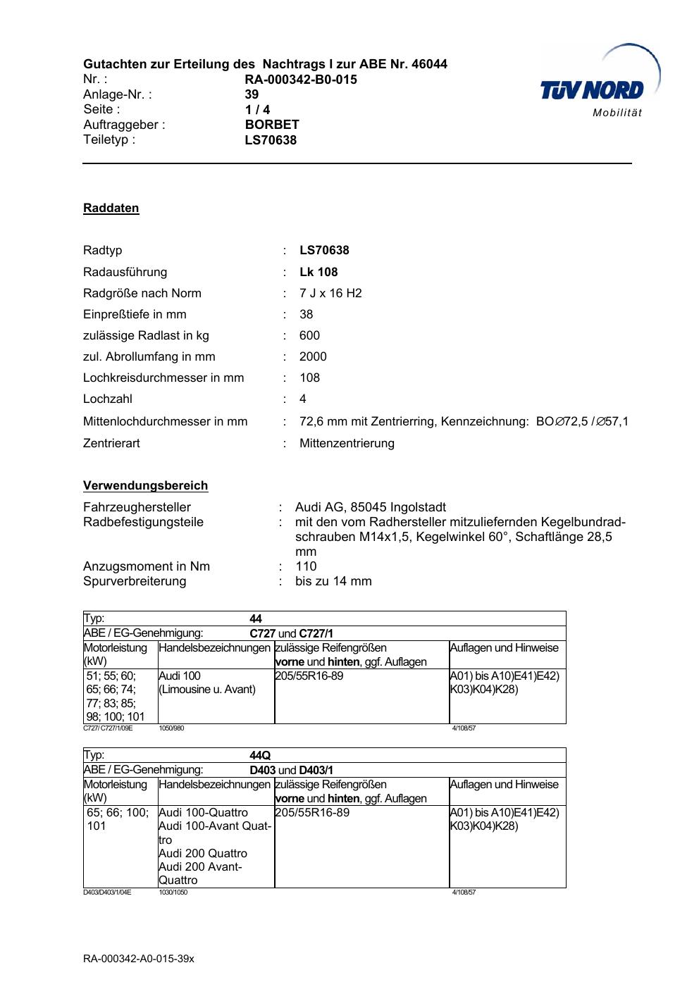 Dieses Gutachten (abe) bezieht sich auf die Alufelge brand-borbet LS70638 in der Ausführung 7Jx16 ET 0, Mittenloch 0 mm (KBA 46044). Im PDF findest du typischerweise zulässige Reifengrößen, Auflagen/Anbauhinweise und – je nach Dokument – Hinweise zur Eintragung.