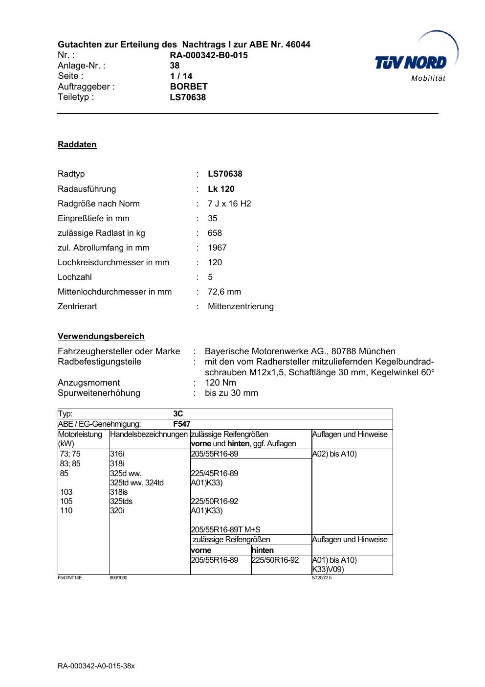 Dieses Gutachten (abe) bezieht sich auf die Alufelge Borbet LS70638 in der Ausführung 7Jx16 ET 0, Mittenloch 0 mm (KBA 46044). Im PDF findest du typischerweise zulässige Reifengrößen, Auflagen/Anbauhinweise und – je nach Dokument – Hinweise zur Eintragung.