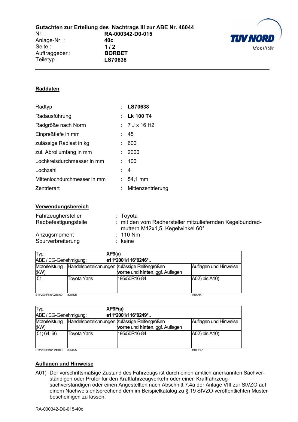 Dieses Gutachten (abe) bezieht sich auf die Alufelge Borbet LS70638 in der Ausführung 7Jx16 ET 0, Mittenloch 0 mm (KBA 46044). Im PDF findest du typischerweise zulässige Reifengrößen, Auflagen/Anbauhinweise und – je nach Dokument – Hinweise zur Eintragung.