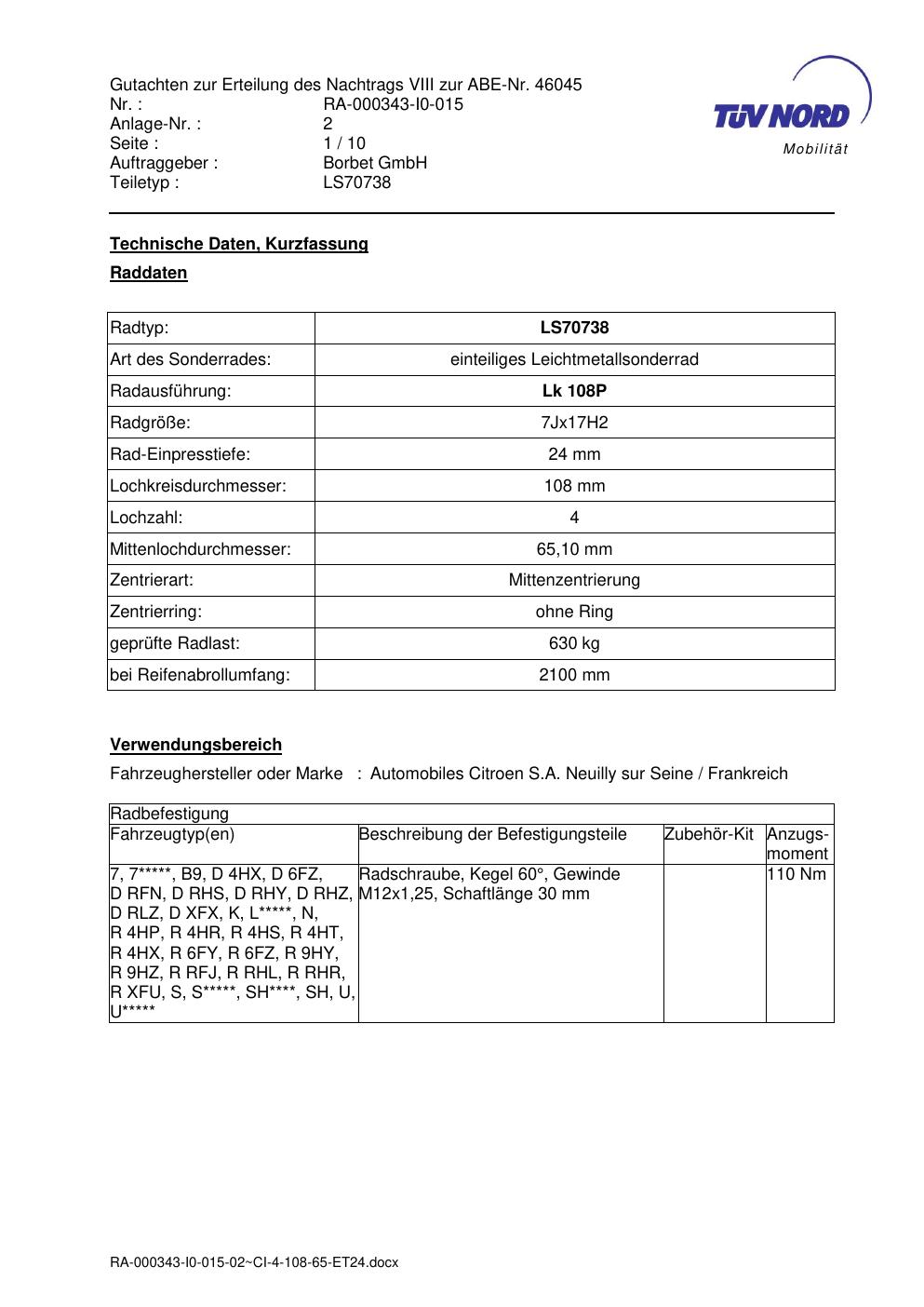 Dieses Gutachten (abe) bezieht sich auf die Alufelge Borbet LS70738 in der Ausführung 7Jx17 ET 0, Mittenloch 0 mm (KBA 46045). Im PDF findest du typischerweise zulässige Reifengrößen, Auflagen/Anbauhinweise und – je nach Dokument – Hinweise zur Eintragung.