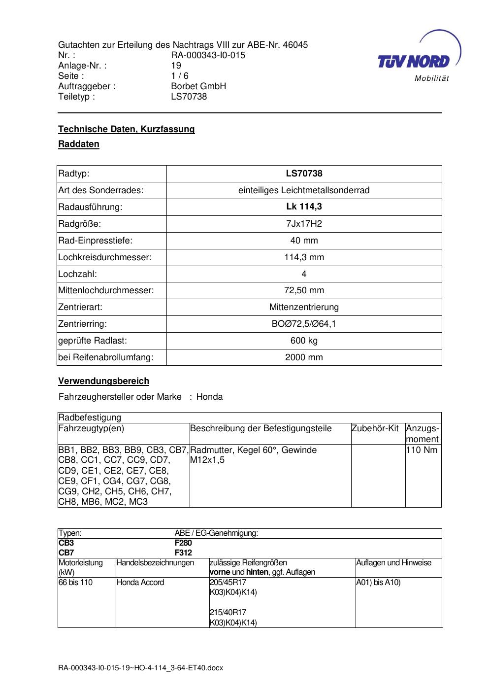 Dieses Gutachten (abe) bezieht sich auf die Alufelge Borbet LS70738 in der Ausführung 7Jx17 ET 0, Mittenloch 0 mm (KBA 46045). Im PDF findest du typischerweise zulässige Reifengrößen, Auflagen/Anbauhinweise und – je nach Dokument – Hinweise zur Eintragung.