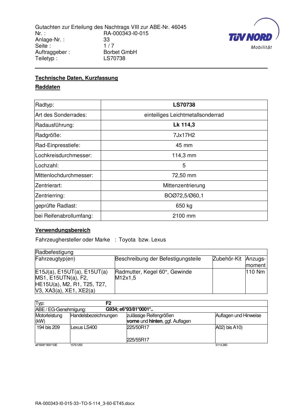 Dieses Gutachten (abe) bezieht sich auf die Alufelge Borbet LS70738 in der Ausführung 7Jx17 ET 0, Mittenloch 0 mm (KBA 46045). Im PDF findest du typischerweise zulässige Reifengrößen, Auflagen/Anbauhinweise und – je nach Dokument – Hinweise zur Eintragung.