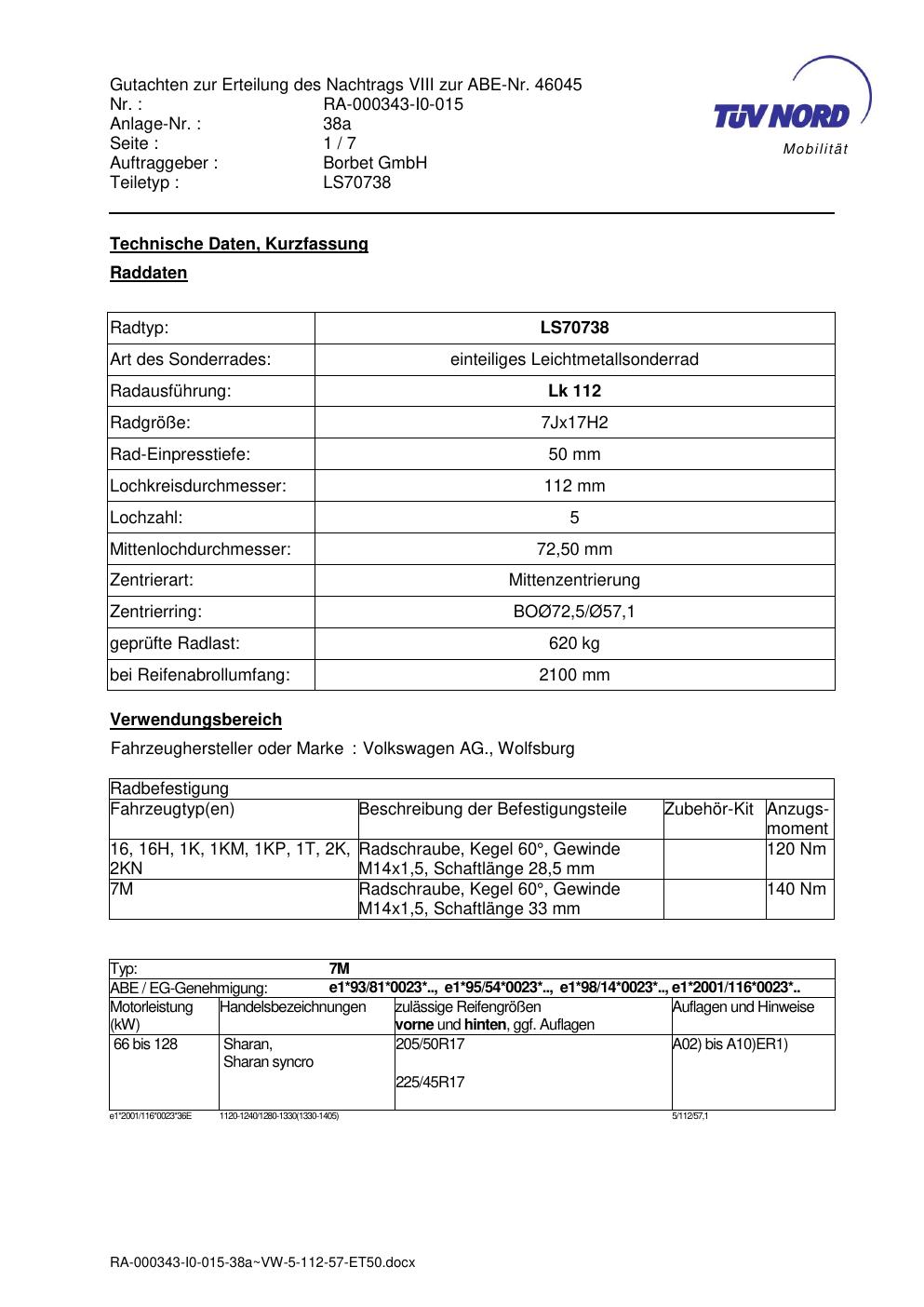 Dieses Gutachten (abe) bezieht sich auf die Alufelge Borbet LS70738 in der Ausführung 7Jx17 ET 0, Mittenloch 0 mm (KBA 46045). Im PDF findest du typischerweise zulässige Reifengrößen, Auflagen/Anbauhinweise und – je nach Dokument – Hinweise zur Eintragung.