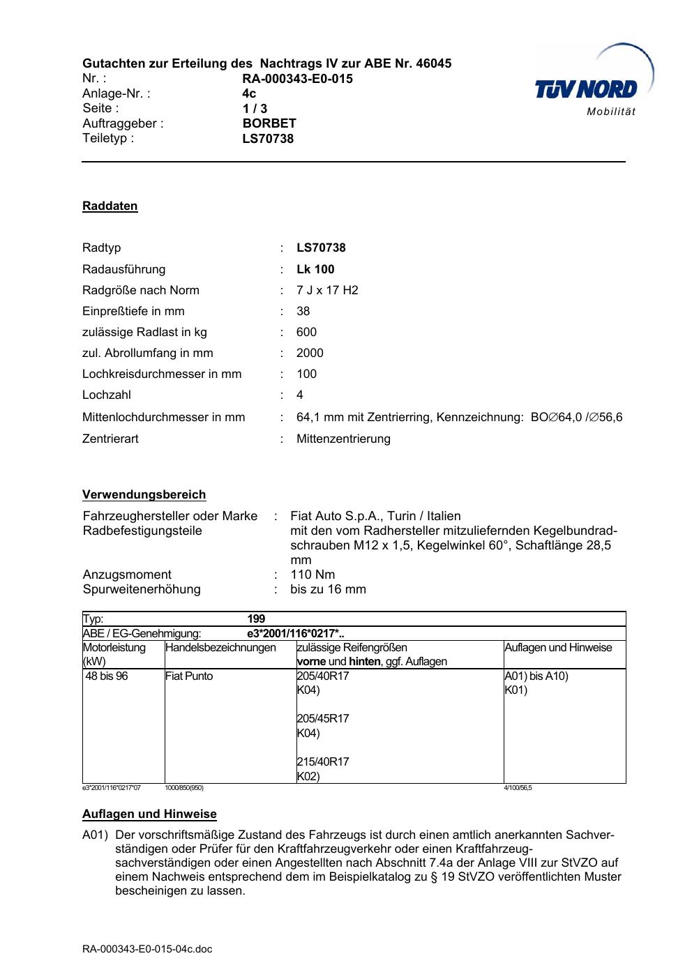 Dieses Gutachten (abe) bezieht sich auf die Alufelge Borbet LS70738 in der Ausführung 7Jx17 ET 0, Mittenloch 0 mm (KBA 46045). Im PDF findest du typischerweise zulässige Reifengrößen, Auflagen/Anbauhinweise und – je nach Dokument – Hinweise zur Eintragung.