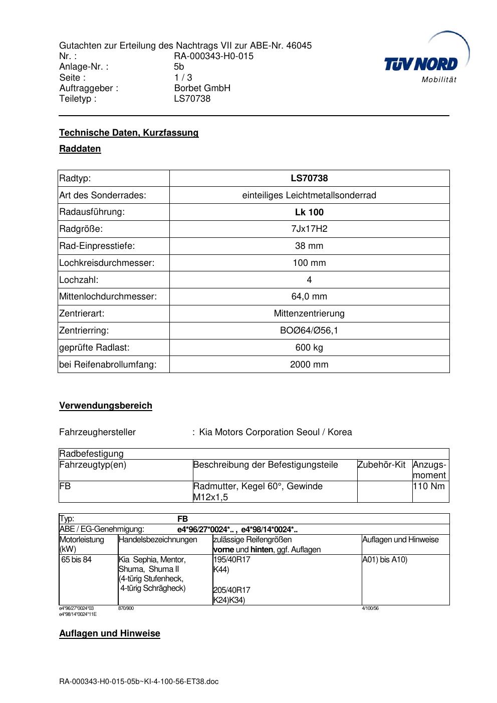 Dieses Gutachten (abe) bezieht sich auf die Alufelge Borbet LS70738 in der Ausführung 7Jx17 ET 0, Mittenloch 0 mm (KBA 46045). Im PDF findest du typischerweise zulässige Reifengrößen, Auflagen/Anbauhinweise und – je nach Dokument – Hinweise zur Eintragung.
