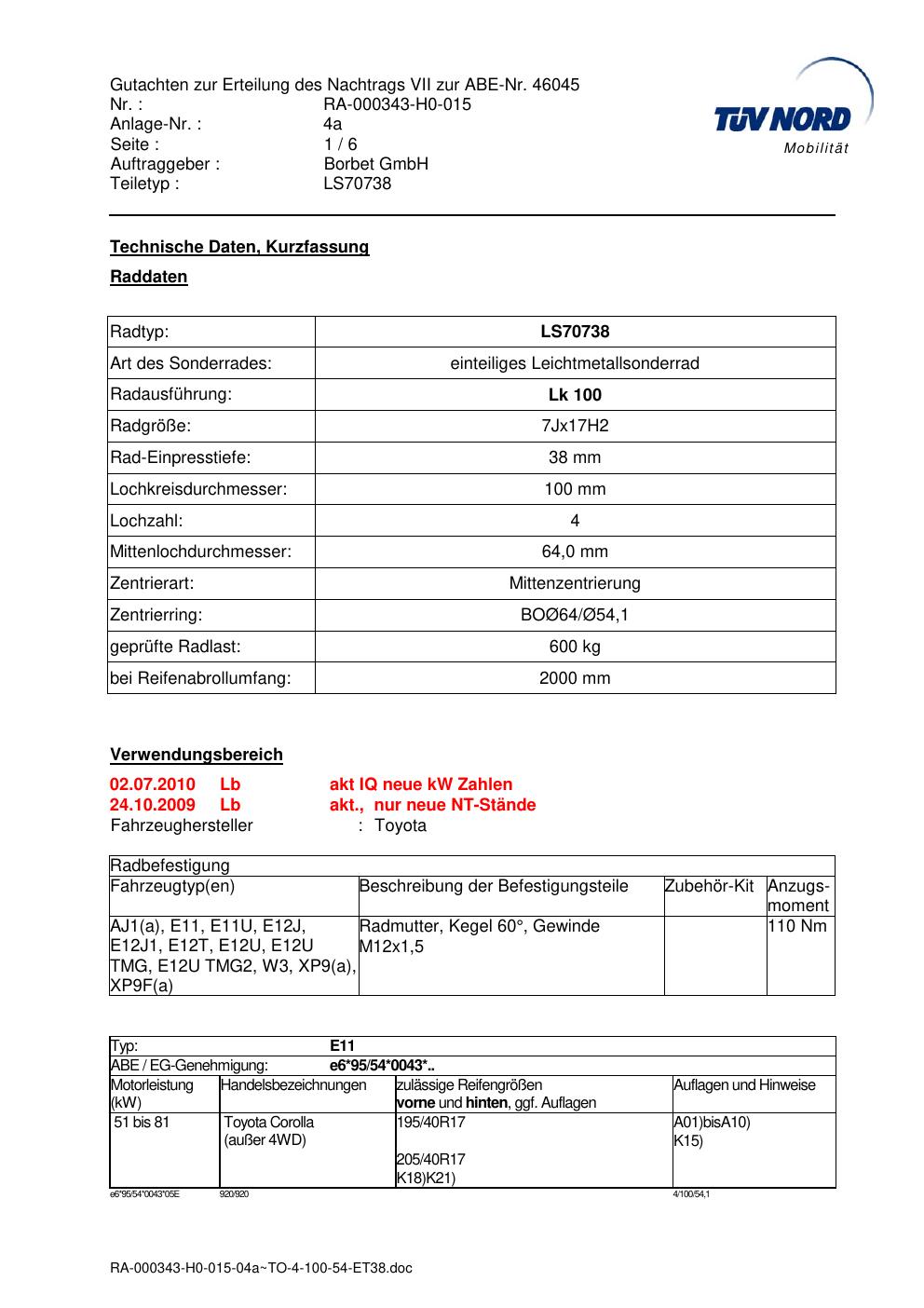 Dieses Gutachten (abe) bezieht sich auf die Alufelge Borbet LS70738 in der Ausführung 7Jx17 ET 0, Mittenloch 0 mm (KBA 46045). Im PDF findest du typischerweise zulässige Reifengrößen, Auflagen/Anbauhinweise und – je nach Dokument – Hinweise zur Eintragung.