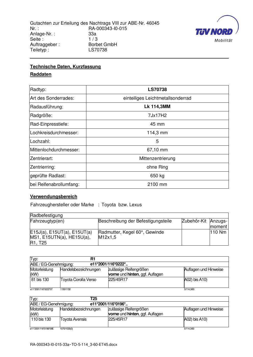 Dieses Gutachten (abe) bezieht sich auf die Alufelge Borbet LS70738 in der Ausführung 7Jx17 ET 0, Mittenloch 0 mm (KBA 46045). Im PDF findest du typischerweise zulässige Reifengrößen, Auflagen/Anbauhinweise und – je nach Dokument – Hinweise zur Eintragung.