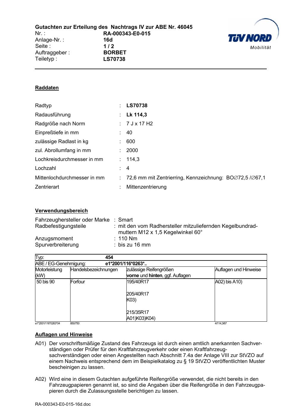 Dieses Gutachten (abe) bezieht sich auf die Alufelge Borbet LS70738 in der Ausführung 7Jx17 ET 0, Mittenloch 0 mm (KBA 46045). Im PDF findest du typischerweise zulässige Reifengrößen, Auflagen/Anbauhinweise und – je nach Dokument – Hinweise zur Eintragung.