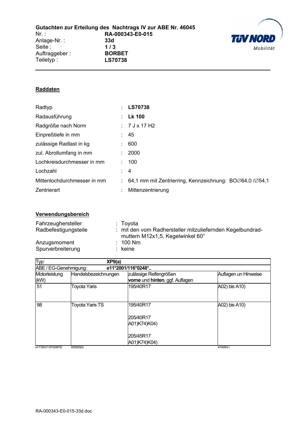 Dieses Gutachten (abe) bezieht sich auf die Alufelge Borbet LS70738 in der Ausführung 7Jx17 ET 0, Mittenloch 0 mm (KBA 46045). Im PDF findest du typischerweise zulässige Reifengrößen, Auflagen/Anbauhinweise und – je nach Dokument – Hinweise zur Eintragung.