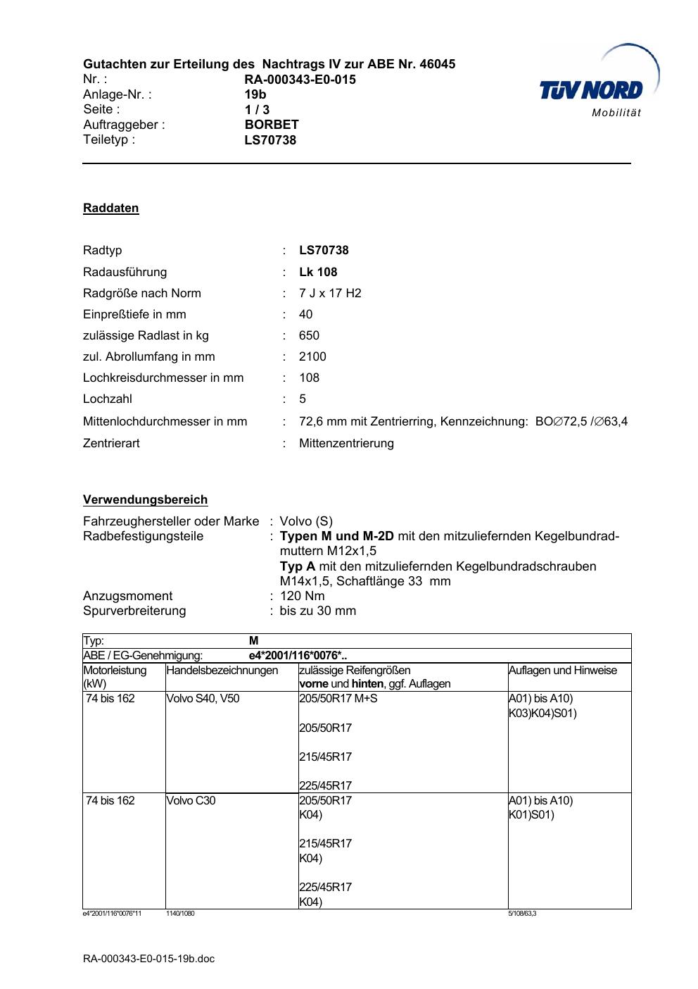 Dieses Gutachten (abe) bezieht sich auf die Alufelge Borbet LS70738 in der Ausführung 7Jx17 ET 0, Mittenloch 0 mm (KBA 46045). Im PDF findest du typischerweise zulässige Reifengrößen, Auflagen/Anbauhinweise und – je nach Dokument – Hinweise zur Eintragung.