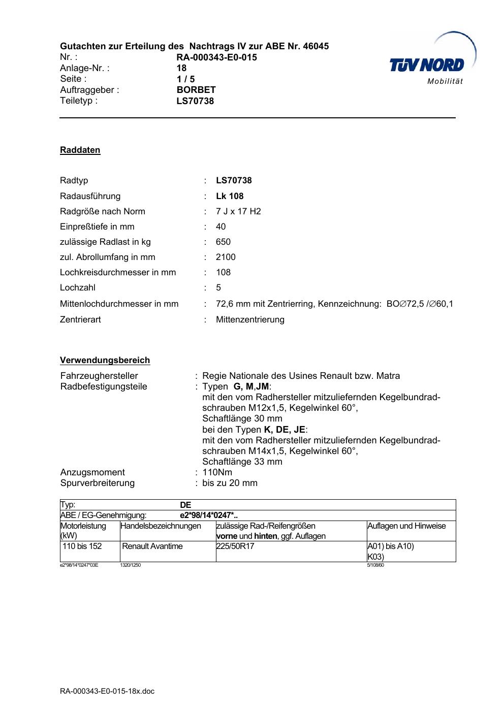 Dieses Gutachten (abe) bezieht sich auf die Alufelge Borbet LS70738 in der Ausführung 7Jx17 ET 0, Mittenloch 0 mm (KBA 46045). Im PDF findest du typischerweise zulässige Reifengrößen, Auflagen/Anbauhinweise und – je nach Dokument – Hinweise zur Eintragung.
