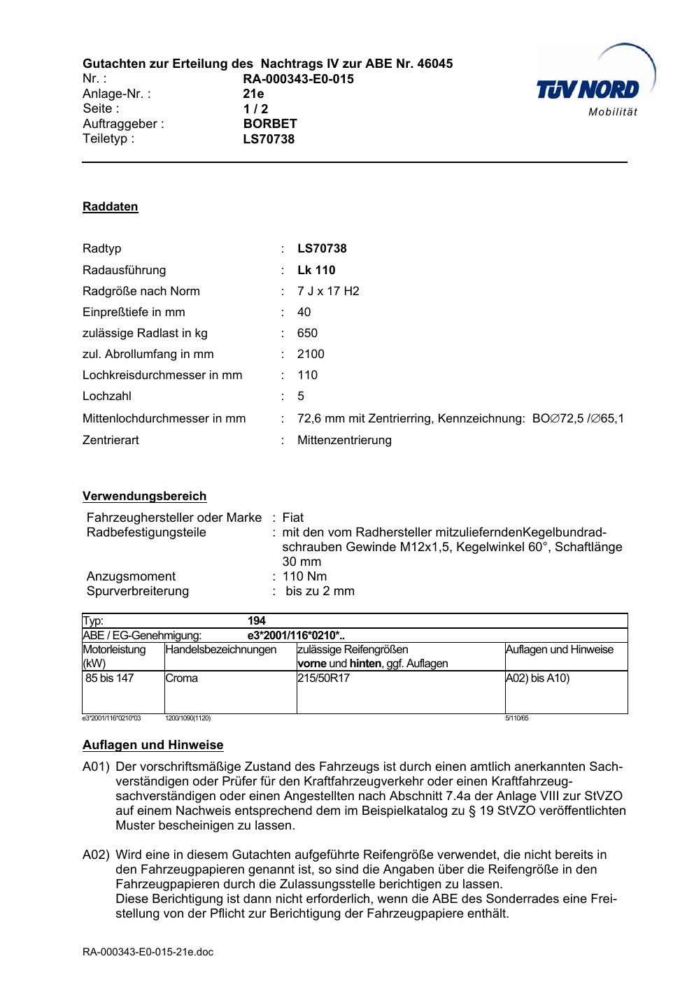 Dieses Gutachten (abe) bezieht sich auf die Alufelge Borbet LS70738 in der Ausführung 7Jx17 ET 0, Mittenloch 0 mm (KBA 46045). Im PDF findest du typischerweise zulässige Reifengrößen, Auflagen/Anbauhinweise und – je nach Dokument – Hinweise zur Eintragung.