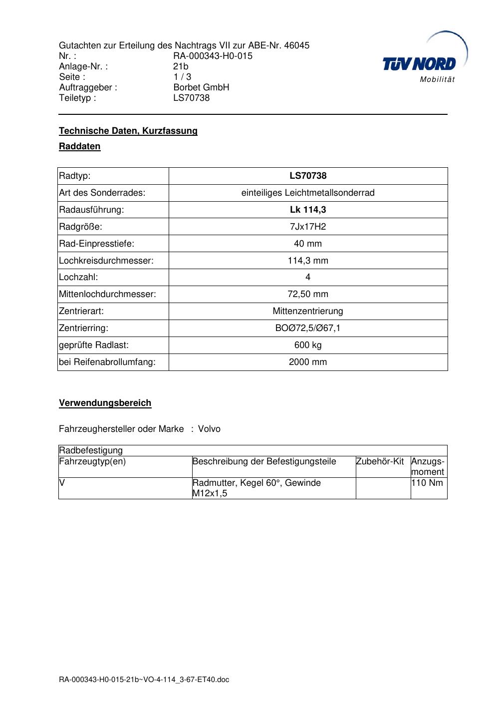Dieses Gutachten (abe) bezieht sich auf die Alufelge Borbet LS70738 in der Ausführung 7Jx17 ET 0, Mittenloch 0 mm (KBA 46045). Im PDF findest du typischerweise zulässige Reifengrößen, Auflagen/Anbauhinweise und – je nach Dokument – Hinweise zur Eintragung.