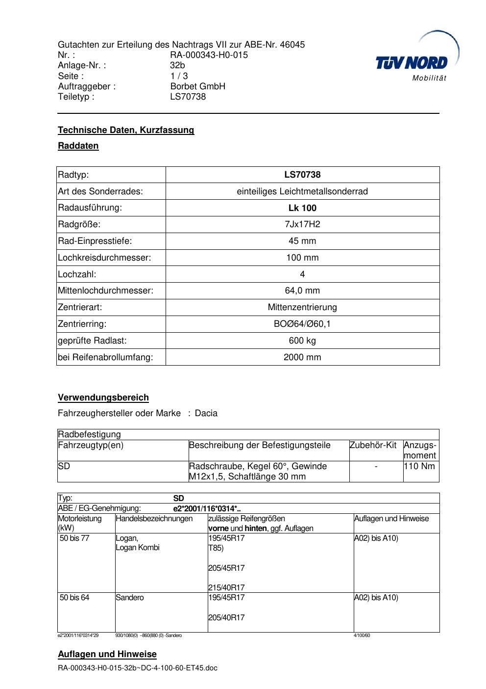 Dieses Gutachten (abe) bezieht sich auf die Alufelge Borbet LS70738 in der Ausführung 7Jx17 ET 0, Mittenloch 0 mm (KBA 46045). Im PDF findest du typischerweise zulässige Reifengrößen, Auflagen/Anbauhinweise und – je nach Dokument – Hinweise zur Eintragung.