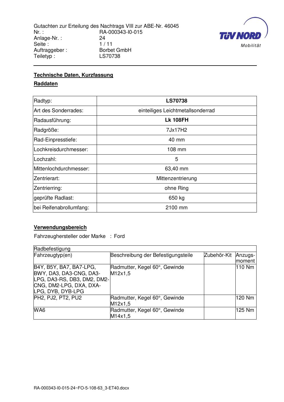 Dieses Gutachten (abe) bezieht sich auf die Alufelge Borbet LS70738 in der Ausführung 7Jx17 ET 0, Mittenloch 0 mm (KBA 46045). Im PDF findest du typischerweise zulässige Reifengrößen, Auflagen/Anbauhinweise und – je nach Dokument – Hinweise zur Eintragung.