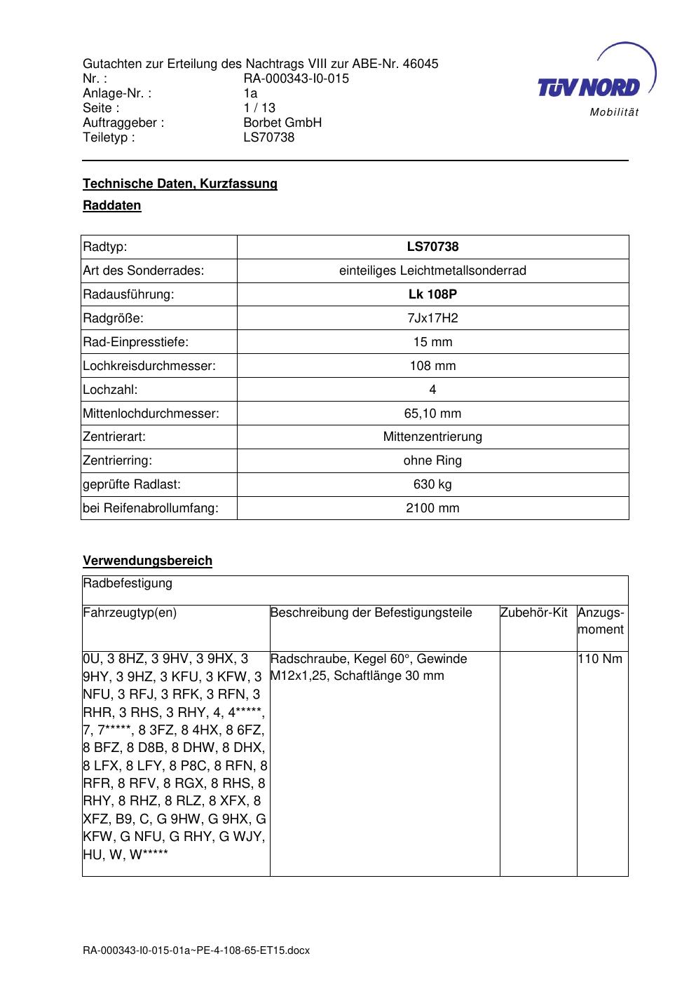 Dieses Gutachten (abe) bezieht sich auf die Alufelge Borbet LS70738 in der Ausführung 7Jx17 ET 0, Mittenloch 0 mm (KBA 46045). Im PDF findest du typischerweise zulässige Reifengrößen, Auflagen/Anbauhinweise und – je nach Dokument – Hinweise zur Eintragung.