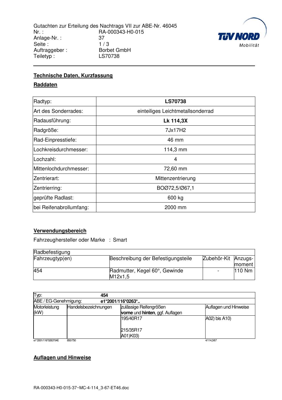 Dieses Gutachten (abe) bezieht sich auf die Alufelge Borbet LS70738 in der Ausführung 7Jx17 ET 0, Mittenloch 0 mm (KBA 46045). Im PDF findest du typischerweise zulässige Reifengrößen, Auflagen/Anbauhinweise und – je nach Dokument – Hinweise zur Eintragung.