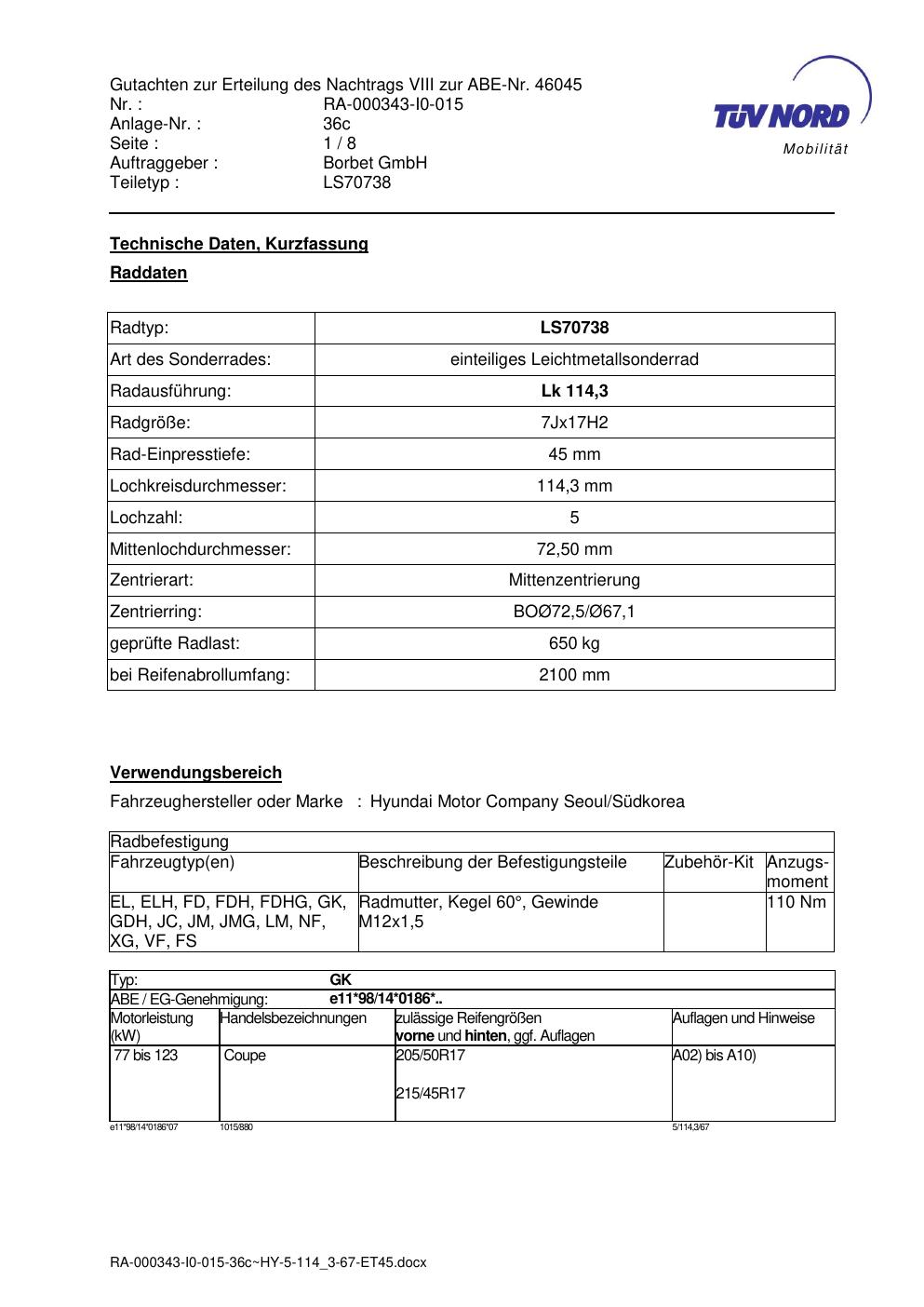 Dieses Gutachten (abe) bezieht sich auf die Alufelge Borbet LS70738 in der Ausführung 7Jx17 ET 0, Mittenloch 0 mm (KBA 46045). Im PDF findest du typischerweise zulässige Reifengrößen, Auflagen/Anbauhinweise und – je nach Dokument – Hinweise zur Eintragung.