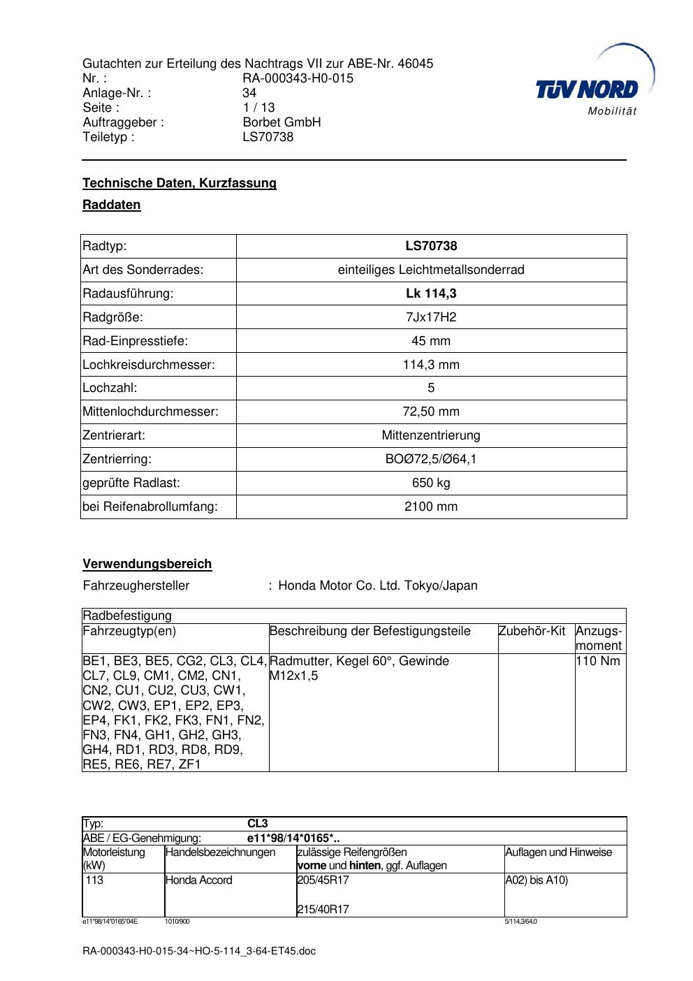 Dieses Gutachten (abe) bezieht sich auf die Alufelge Borbet LS70738 in der Ausführung 7Jx17 ET 0, Mittenloch 0 mm (KBA 46045). Im PDF findest du typischerweise zulässige Reifengrößen, Auflagen/Anbauhinweise und – je nach Dokument – Hinweise zur Eintragung.