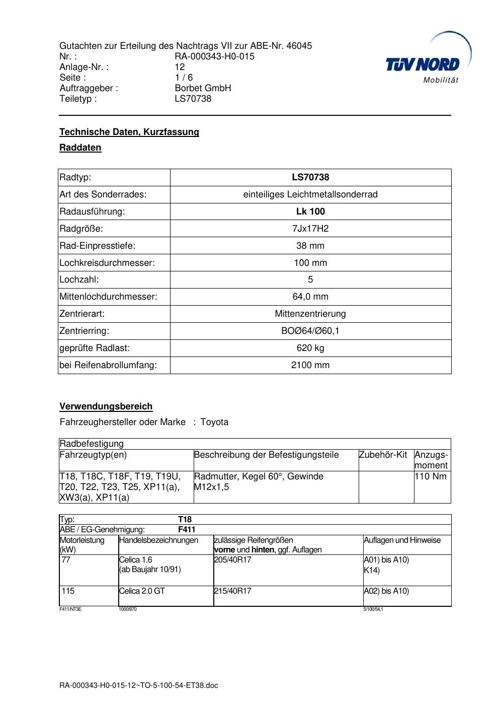 Dieses Gutachten (abe) bezieht sich auf die Alufelge Borbet LS70738 in der Ausführung 7Jx17 ET 0, Mittenloch 0 mm (KBA 46045). Im PDF findest du typischerweise zulässige Reifengrößen, Auflagen/Anbauhinweise und – je nach Dokument – Hinweise zur Eintragung.