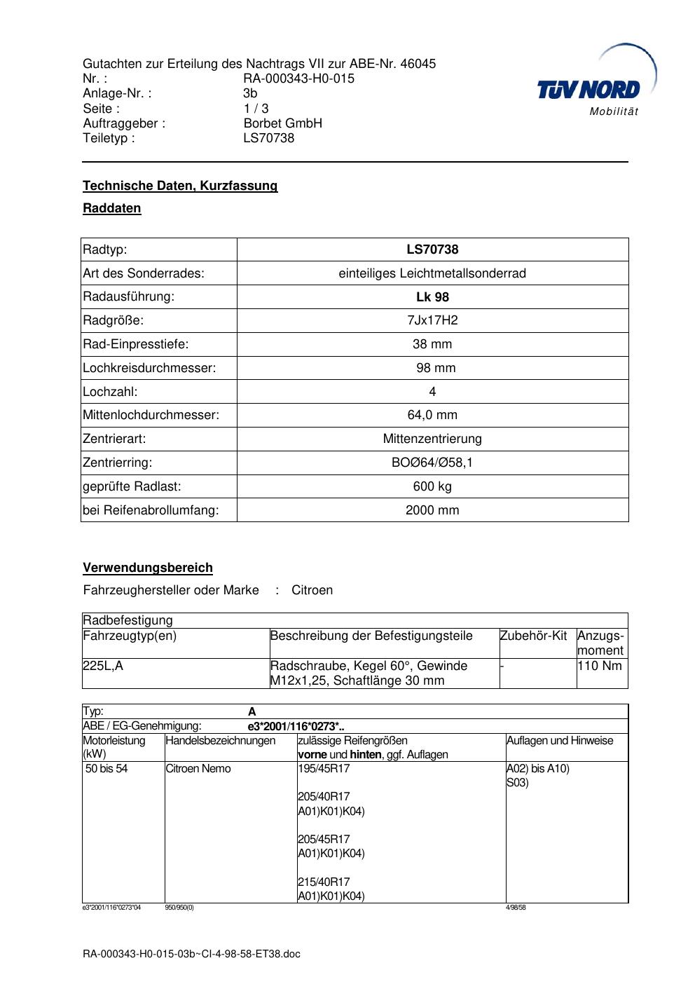 Dieses Gutachten (abe) bezieht sich auf die Alufelge Borbet LS70738 in der Ausführung 7Jx17 ET 0, Mittenloch 0 mm (KBA 46045). Im PDF findest du typischerweise zulässige Reifengrößen, Auflagen/Anbauhinweise und – je nach Dokument – Hinweise zur Eintragung.