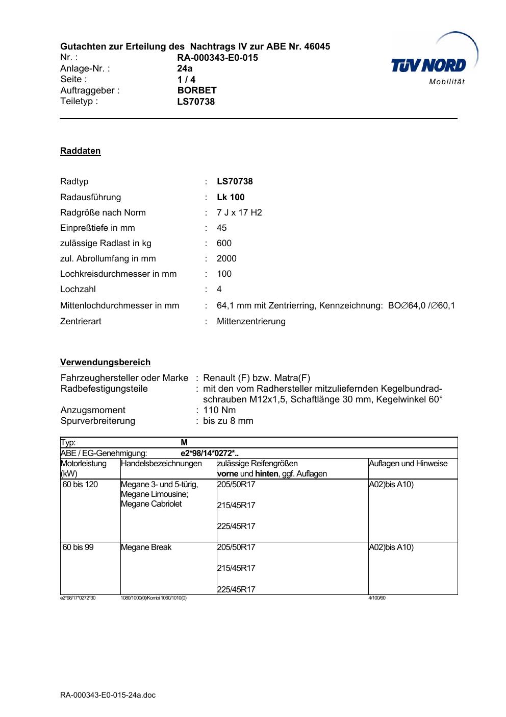 Dieses Gutachten (abe) bezieht sich auf die Alufelge Borbet LS70738 in der Ausführung 7Jx17 ET 0, Mittenloch 0 mm (KBA 46045). Im PDF findest du typischerweise zulässige Reifengrößen, Auflagen/Anbauhinweise und – je nach Dokument – Hinweise zur Eintragung.