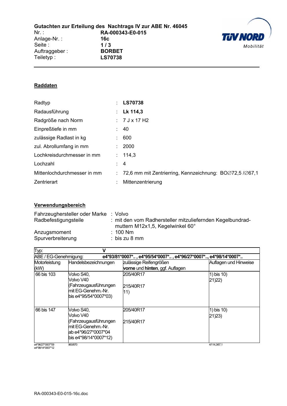 Dieses Gutachten (abe) bezieht sich auf die Alufelge Borbet LS70738 in der Ausführung 7Jx17 ET 0, Mittenloch 0 mm (KBA 46045). Im PDF findest du typischerweise zulässige Reifengrößen, Auflagen/Anbauhinweise und – je nach Dokument – Hinweise zur Eintragung.