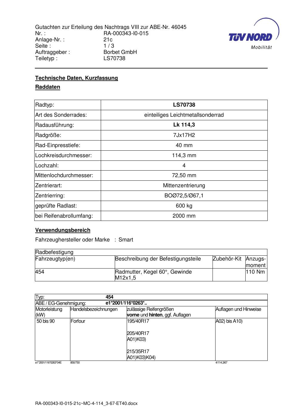 Dieses Gutachten (abe) bezieht sich auf die Alufelge Borbet LS70738 in der Ausführung 7Jx17 ET 0, Mittenloch 0 mm (KBA 46045). Im PDF findest du typischerweise zulässige Reifengrößen, Auflagen/Anbauhinweise und – je nach Dokument – Hinweise zur Eintragung.