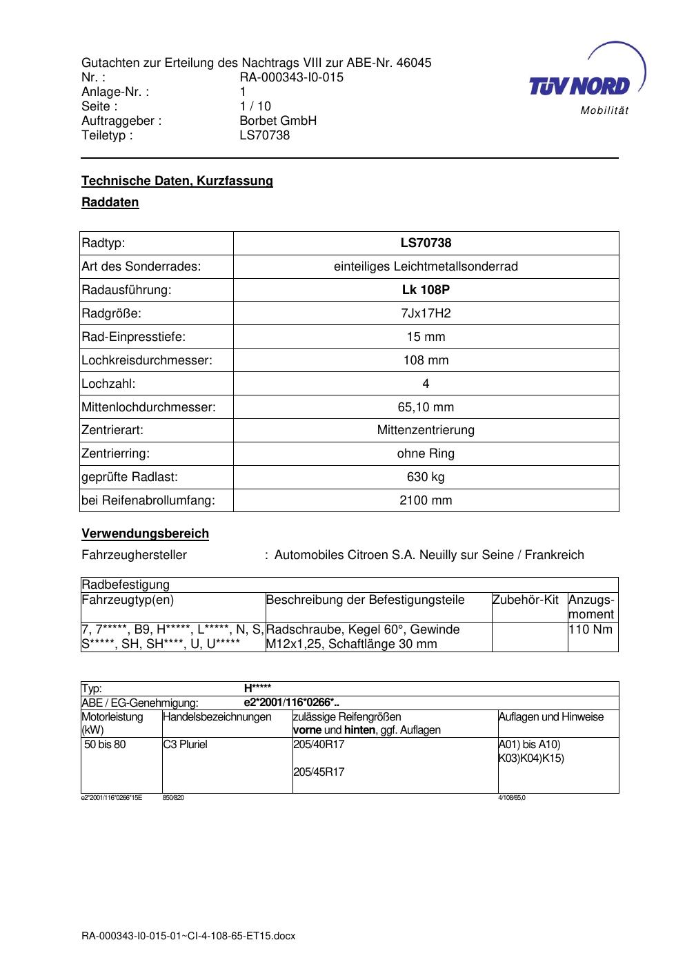 Dieses Gutachten (abe) bezieht sich auf die Alufelge Borbet LS70738 in der Ausführung 7Jx17 ET 0, Mittenloch 0 mm (KBA 46045). Im PDF findest du typischerweise zulässige Reifengrößen, Auflagen/Anbauhinweise und – je nach Dokument – Hinweise zur Eintragung.